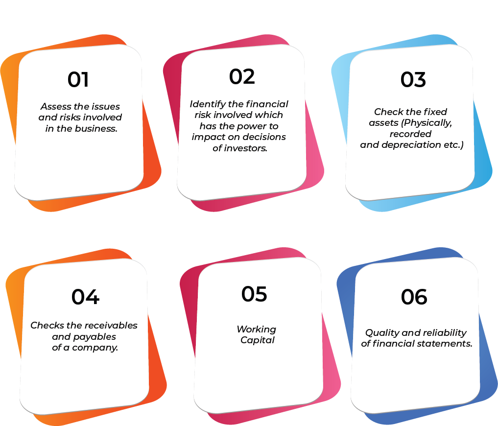 Deals with the detailed investigation of financial statements of the target company. The team work is to understand the challenges, trends of a company. Finding the shortcomings of a company along with the solutions to have a seamless transaction.