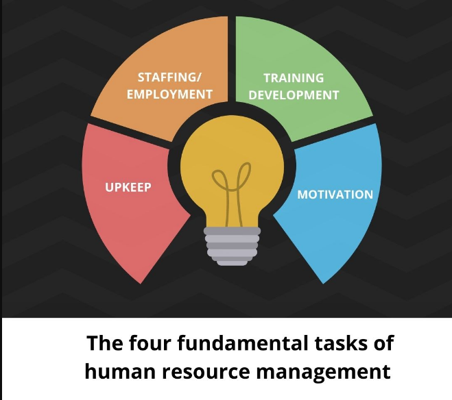The four fundamental tasks of human resource management are employment, training and development, motivation, and upkeep.