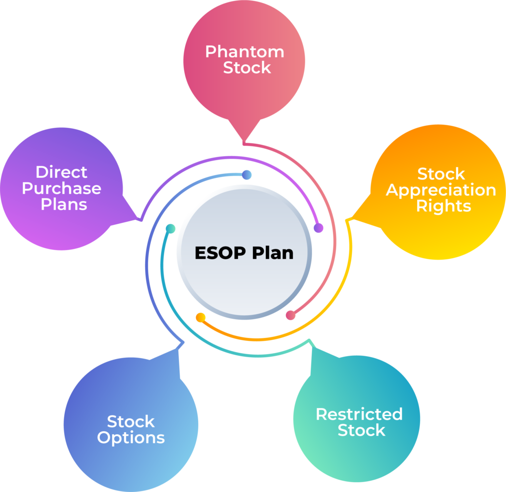 Direct purchase plan, phantom stock, stock appreciation rights, restricted stock, and stock options are the five different plans that come under ESOP.
